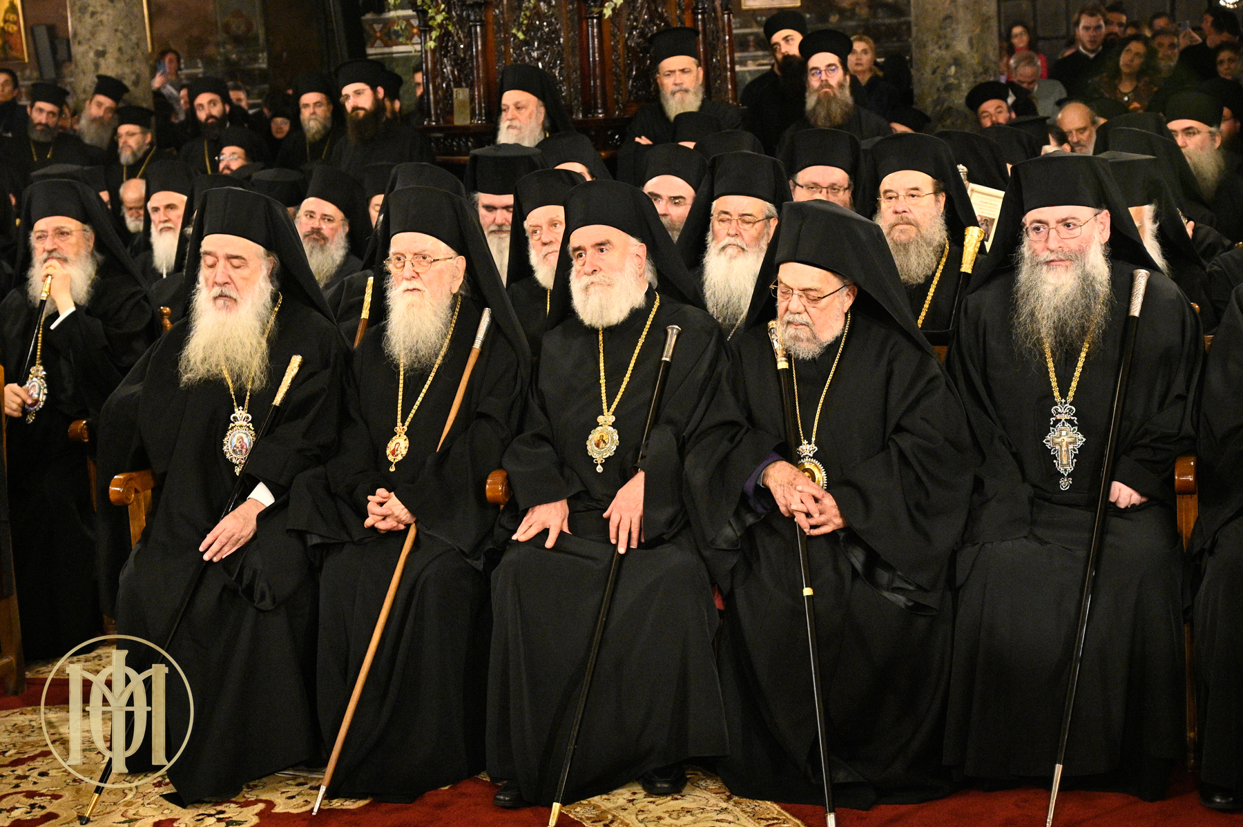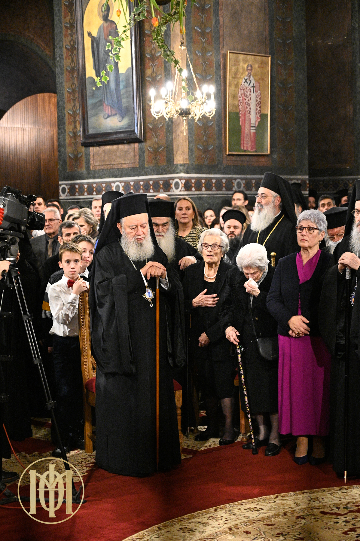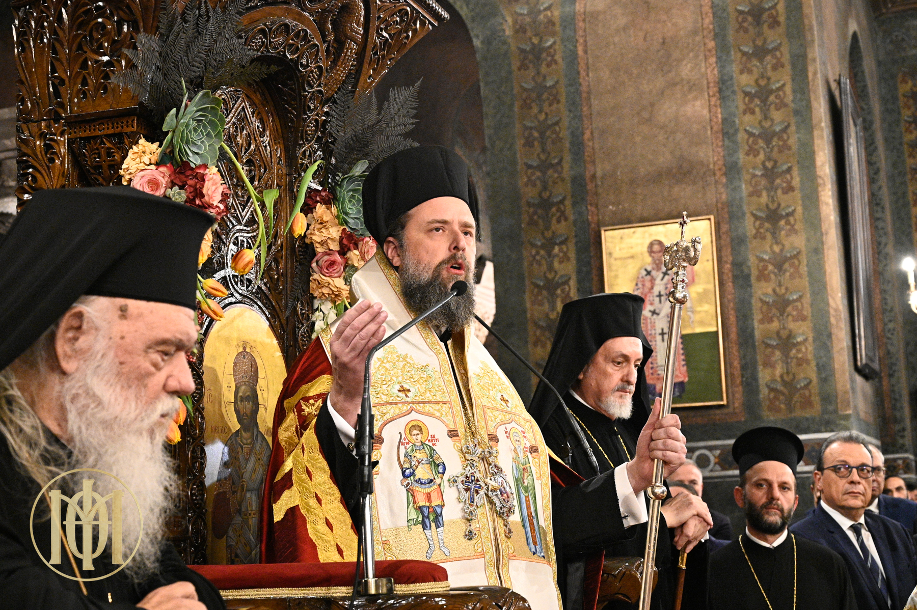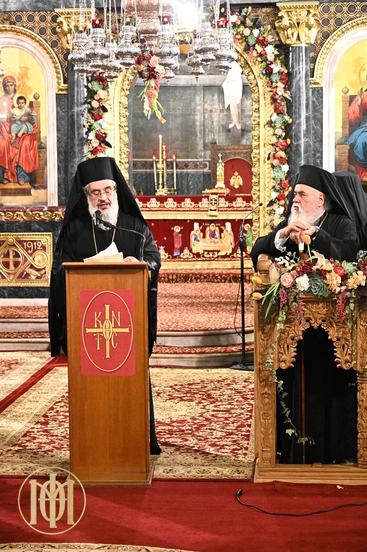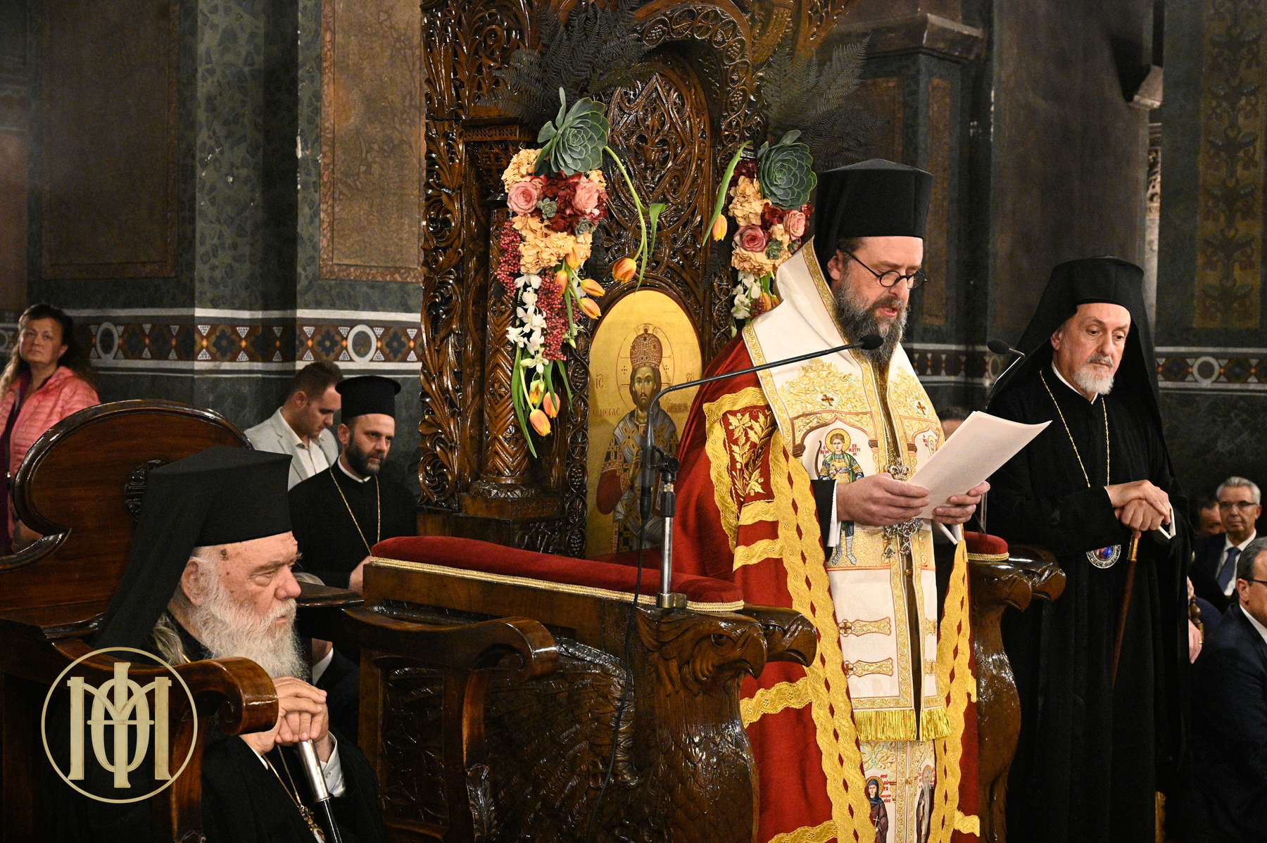 Τά σεπτά μέλη τῆς Ἱεραρχίας τῆς Ἐκκλησίας τῆς Ἑλλάδος, τά παρόντα καί τά ἀπόντα, τούς παρόντες ἀδελφούς Ἱεράρχες ἄλλων Πατριαρχείων καί Αὐτοκεφάλων Ἐκκλησιῶν καί τούς τιμίους συνοδούς τους, θερμότατα εὐχαριστῶ γιά τήν προσευχητική συμμετοχή τους στή χαρά αὐτήν τῆς Τοπικῆς μας Ἐκκλησίας καί τήν τιμή πού μοῦ περιποιοῦν.