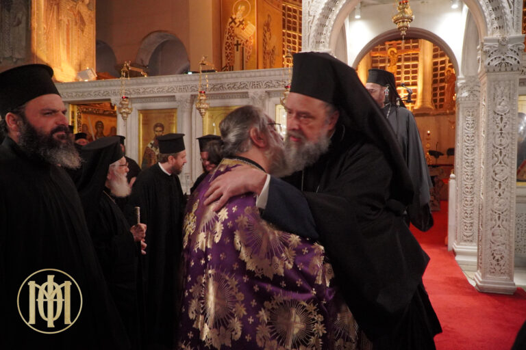 Εν συνεχεία αντάλλαξε, σύμφωνα με την τάξη της Εκκλησίας μας, τον ασπασμό της αλληλοσυγχωρήσεως με τους κληρικούς και το ποίμνιο της Μητροπόλεώς μας.