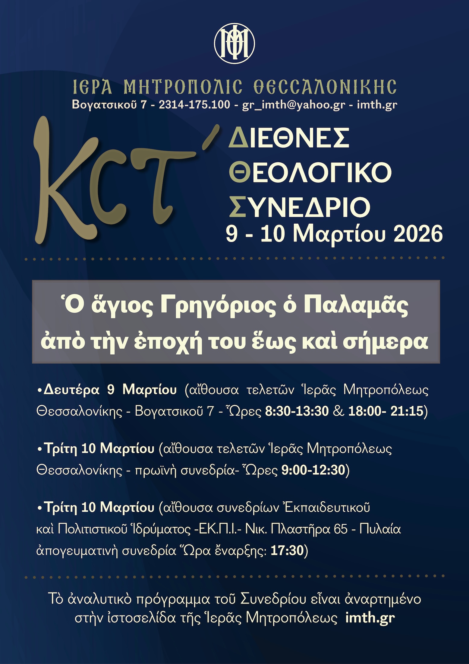 Τέλος, υπενθυμίζουμε, ότι κατά το διήμερο, Δευτέρα 9η και Τρίτη, 10η Μαρτίου, θα διεξαχθεί το 26ο Διεθνές Επιστημονικό Θεολογικό Συνέδριο της Ιεράς Μητροπόλεως Θεσσαλονίκης, αφιερωμένο στην τιμή και μνήμη του αγίου Γρηγορίου του Παλαμά, στο οποίο θα συμμετάσχουν ως εισηγητές, εκλεκτοί επιστήμονες και ακαδημαϊκοί θεολόγοι από την Ελλάδα και το εξωτερικό, που έχουν ασχοληθεί επισταμένως με τη ζωή, το έργο και τη διδασκαλία του μεγάλου Πατρός της Εκκλησίας μας και Συμπολιούχου της Θεσσαλονίκης.