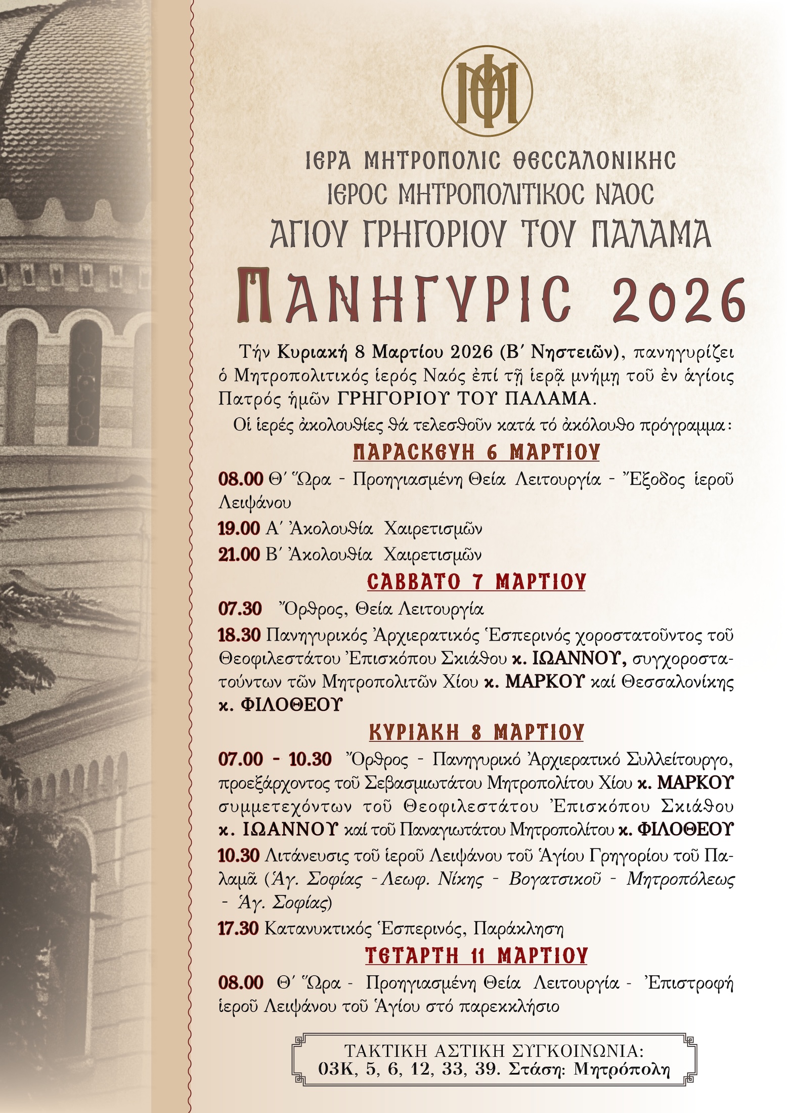 Με αισθήματα πνευματικής χαράς, η τοπική μας, αποστολική Εκκλησία της αγιοτόκου Θεσσαλονίκης προτίθεται να τιμήσει και εφέτος τον συμπολιούχο μας, άγιο Γρηγόριο τον Παλαμά, πανηγυρικώς εορτάζοντας την μνήμη του στον επ΄ ονόματι του Μητροπολιτικό Ιερό Ναό, όπου και πρόκειται να πραγματοποιηθούν λατρευτικές εκδηλώσεις σύμφωνα με το παρακάτω πρόγραμμα: